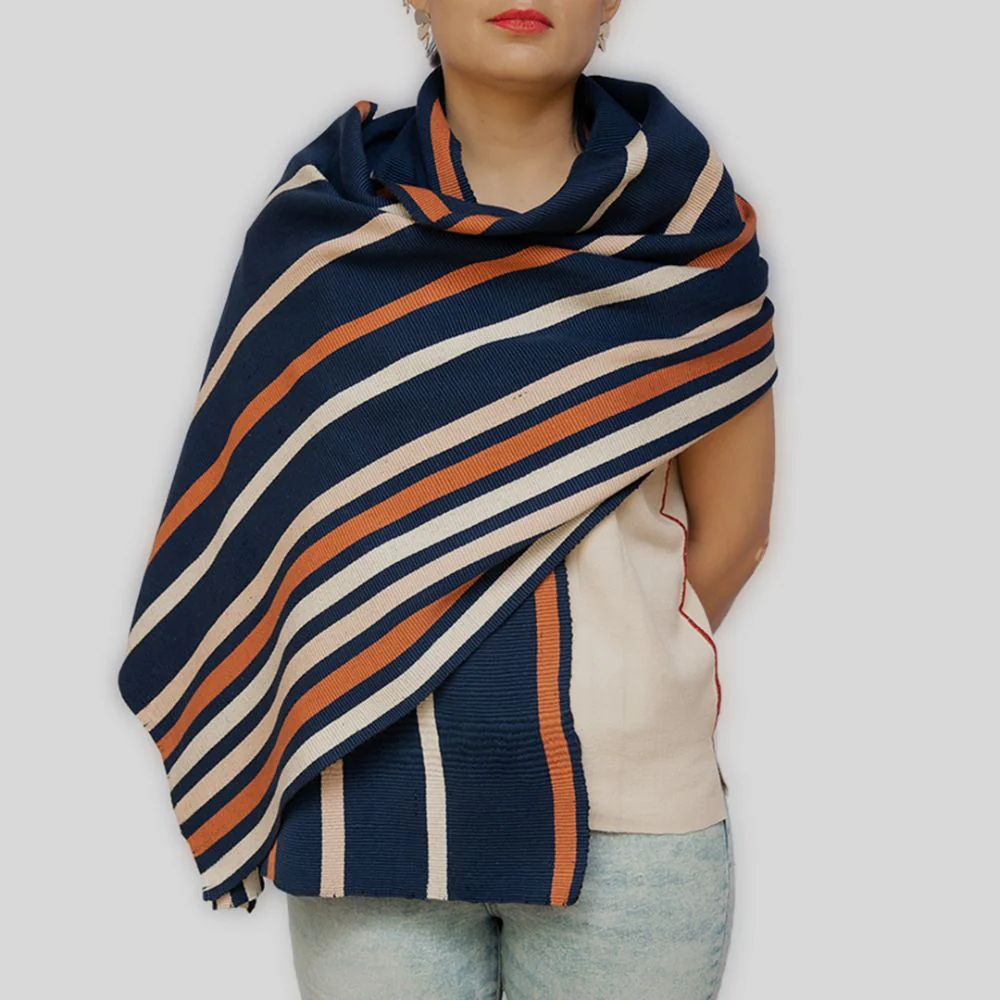 El Chal Akobal ("Noche" en tsotsil) esta tejido a mano en telar de cintura. Lleva algodón en su urdimbre para un tacto suave y trama de lana de los altos de Chiapas para calidez y comodidad. Esta pieza es representativa de las manos expertas y del saber-hacer de las artesanas de los Altos de Chiapas.